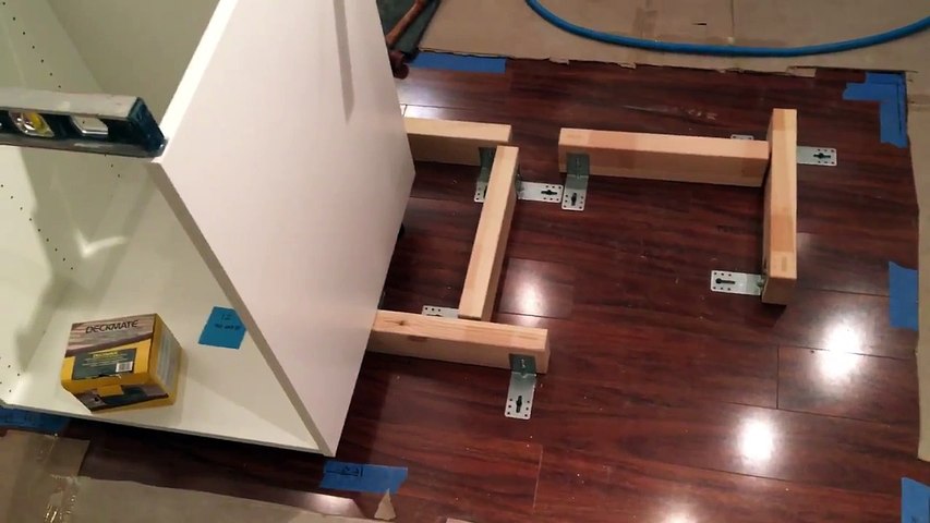 Consult a professional before fixing to floor as there may be an underfloor heating system in the floor. To create more counter space we built our very own 7 -foot island that is also home to our kitchen sink and dishwasher. So off to Bunnings we went but havent yet found brackets to match.